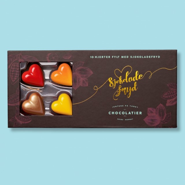 En eske full av omtanke og kjærlighet. Gaveesken Sjokoladehjerter inneholder 10 ulike favoritter med Sjokoladefryd. Esken er som et smykkeskrin i seg selv, med flotte, smakfulle sjokoladebiter i hjerteform.