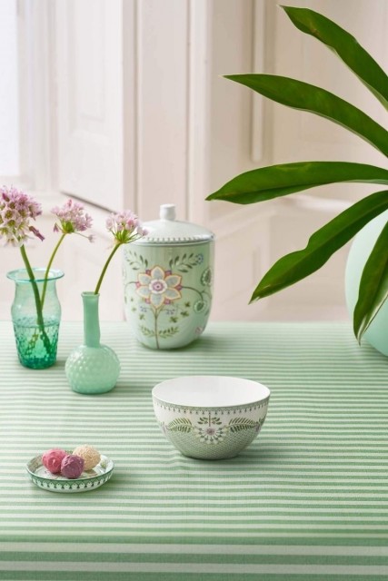 Denne mellomstore skålen er en del av vår Lily & Lotus-kolleksjon. Den lysegrønne skålen er dekorert med små grafiske blomster. Blomstene og de elegante bregnene er plassert symmetrisk, noe som gir skålen et moderne uttrykk. Lily & Lotus er det første serviset i Pip Studio sin kolleksjon som tåler oppvaskmaskin, mikrobølgeovn og stekeovn.